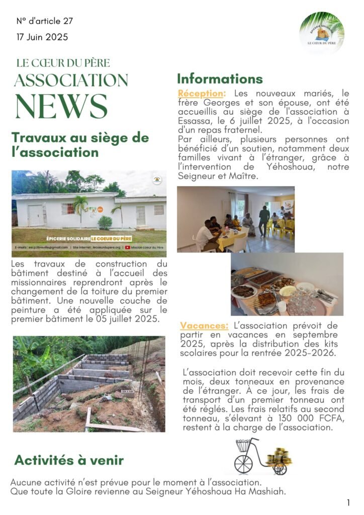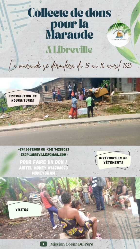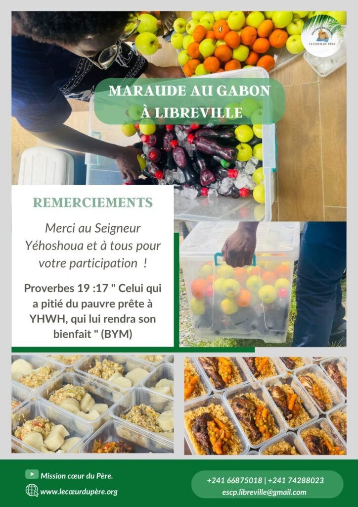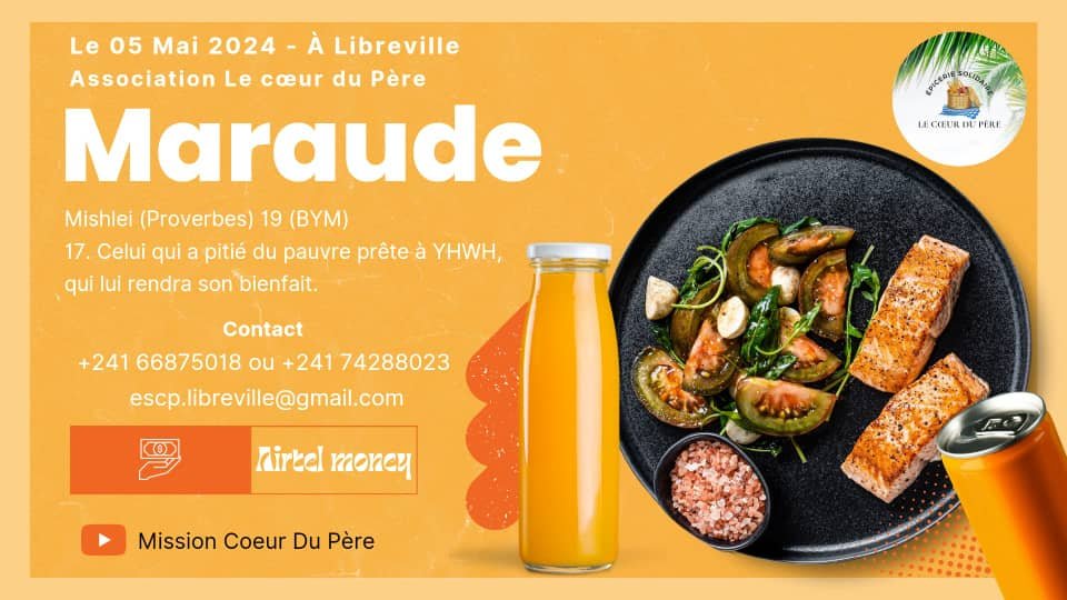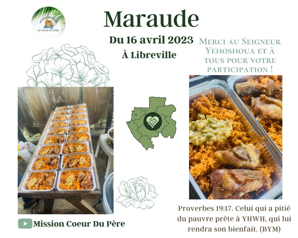 L' Association " Le Cœur du Père" organise une maraude prévu le 05 Mai 2024, il sera question de faire à manger et acheter aussi à boire pour aller à la rencontre des personnes démunies dans les rues de Libreville-Gabon, pour non seulement leur offrir à manger et à boire mais aussi leur témoigner l'Amour d’Élohim en leur présentant aussi l'Évangile du Royaume des Cieux.